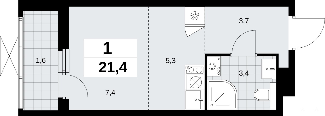 1-комн. квартира-студия с отделкой в ЖК "Бунинские кварталы" на 9 этаже. Общая площадь: 21.4 кв.м., площадь гостиной 12.7 кв.м., из которых 5.3 кв.м. выделено под кухонную зону. Все окна выходят на одну сторону. В квартире один балкон, один совмещенный санузел. Высота потолков 2.8 м.