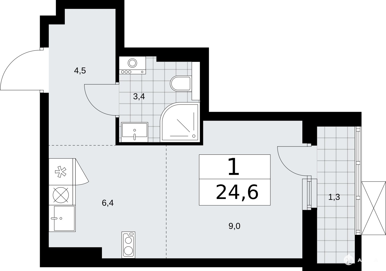 Продается 1-комн. квартира-студия в ЖК "Бунинские кварталы" на 10 этаже. Квартира без отделки, полностью готова к чистовой отделке и дальнейшему ремонту. Общая площадь: 24.6 кв.м., площадь гостиной 15.4 кв.м., из которых 6.4 кв.м. выделено под кухонную зону. Все окна выходят на одну сторону. В квартире один балкон, один совмещенный санузел. Высота потолков 2.8 м.