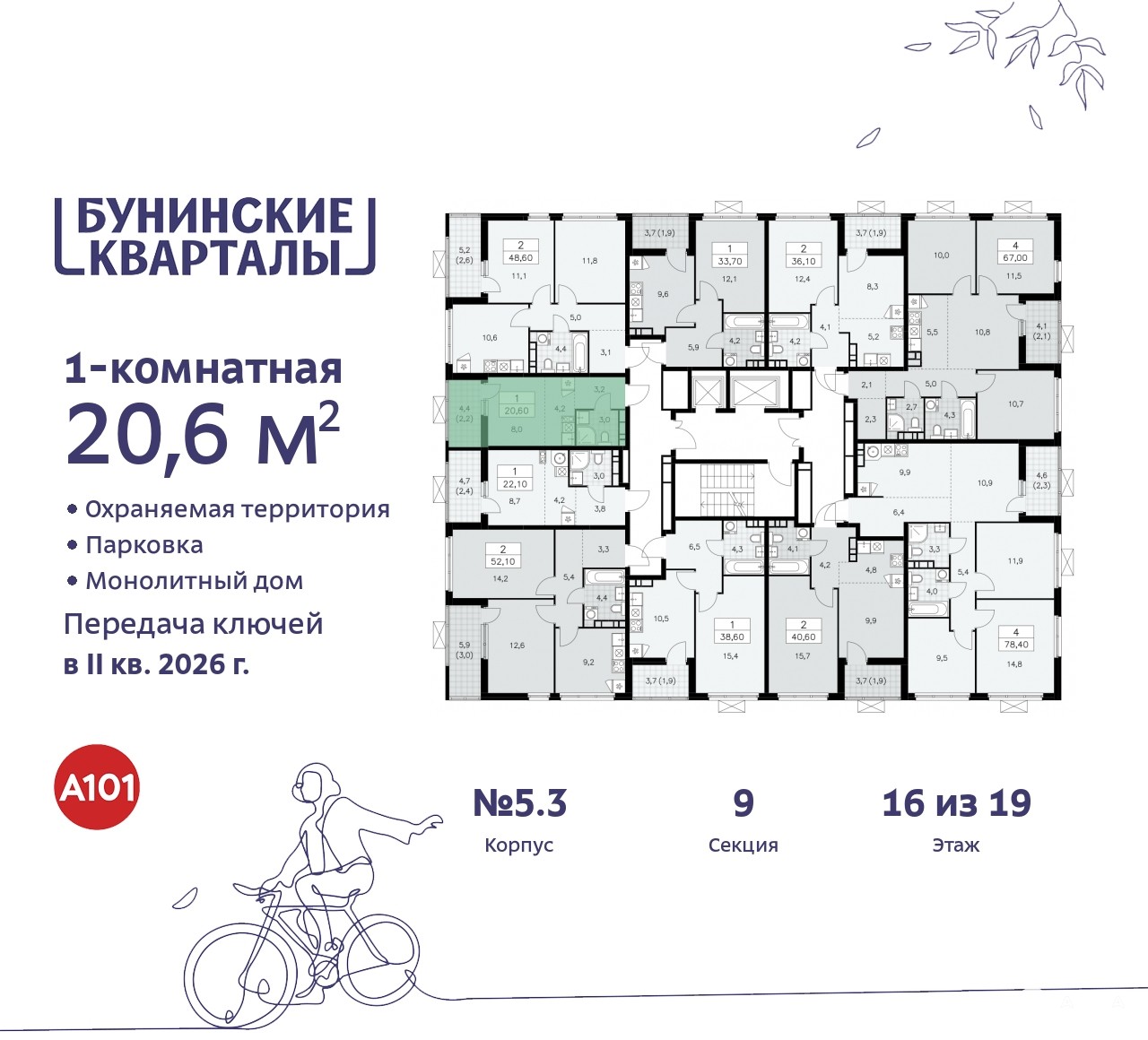 Квартира находится в корпусе 5.3. Дом монолитный, одноподъездный, высотой 19 этажей. На этаже 10 квартир. В подъезде 1 пассажирский и 1 грузовой лифт. Начало строительства - 4 квартал 2023 года. Окончание строительства - 2 квартал 2026 года. Оформление сделки по договору долевого участия.