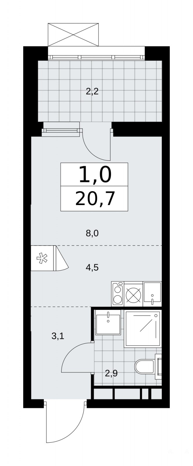 1-комн. квартира бизнес-класса-студия от застройщика с предчистовой отделкой в ЖК "Бунинские кварталы" на 9 этаже. Общая площадь: 20.7 кв.м., площадь гостиной 12.5 кв.м., из которых 4.5 кв.м. выделено под кухонную зону. Все окна выходят на одну сторону. В квартире один балкон, один совмещенный санузел. Высота потолков 3.1 м.