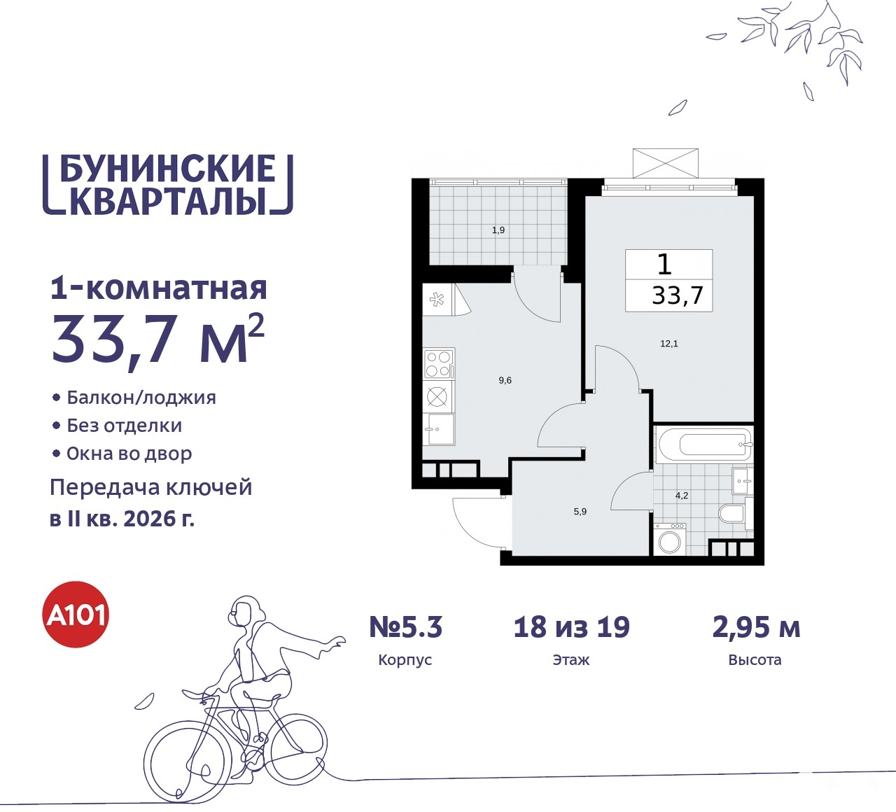 Просторная однокомнатная квартира в ЖК "Бунинские кварталы" на 18 этаже. Квартира без отделки, после оформления собственности можно делать ремонт. Общая площадь: 33.7 кв.м., жилая: 12.1 кв.м., площадь просторной кухни-столовой: 9.6 кв.м. Все окна выходят на одну сторону. В квартире одна лоджия, один совмещенный санузел. Высота потолков 2.85 м.
