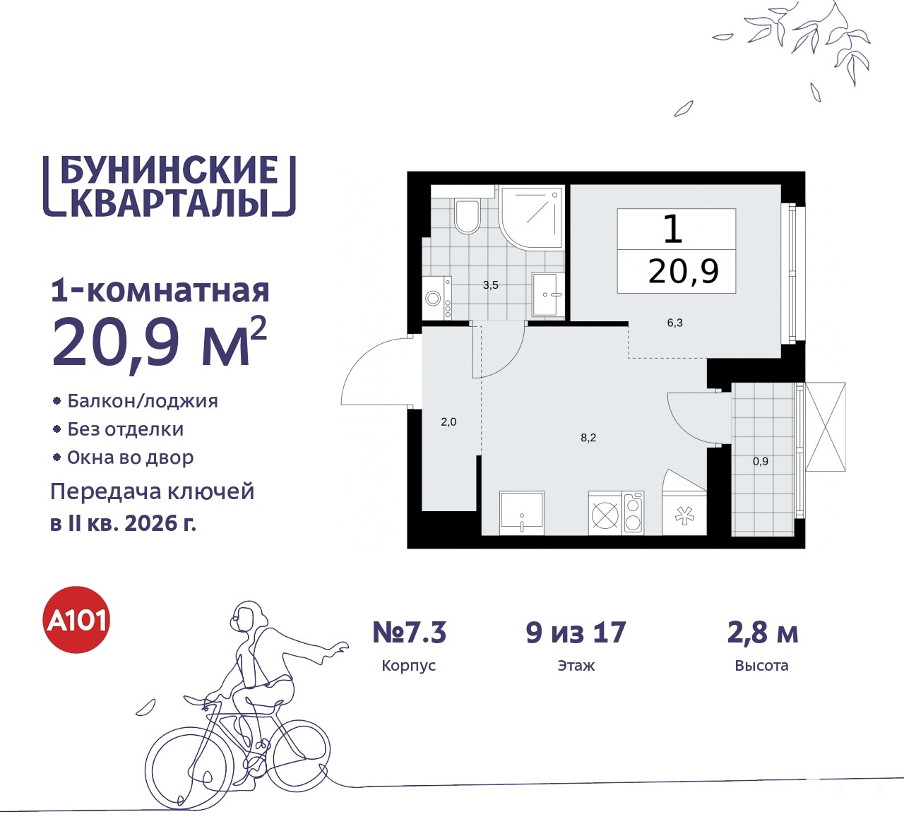 1-комн. квартира-студия в ЖК "Бунинские кварталы" на 9 этаже. Квартира без отделки, после выдачи ключей можно делать ремонт. Общая площадь: 20.9 кв.м., площадь гостиной 14.5 кв.м., из которых 8.2 кв.м. выделено под кухонную зону. Все окна выходят на одну сторону. В квартире одна лоджия, один совмещенный санузел. Высота потолков 2.8 м.