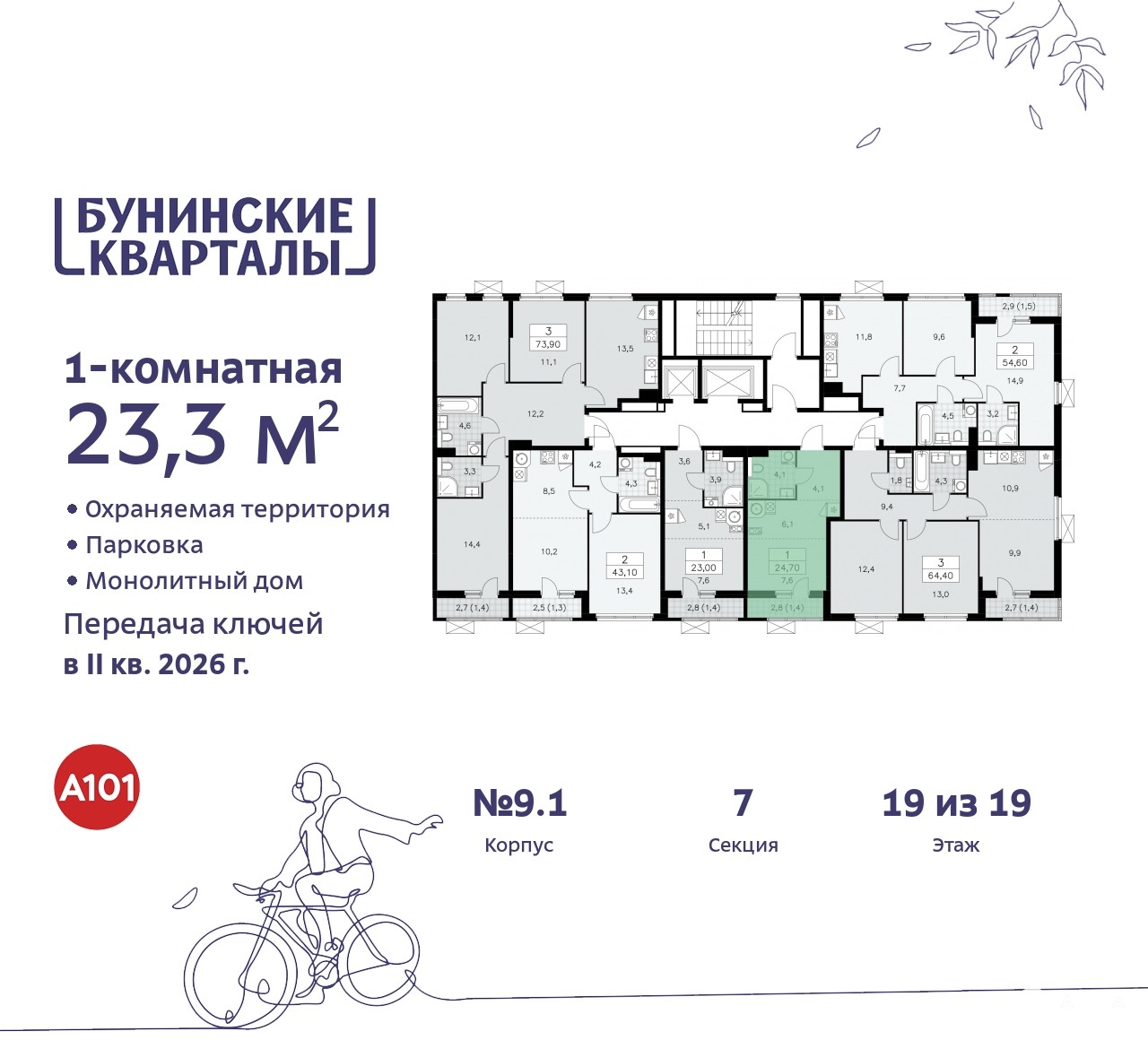 Дом монолитный, многоподъездный, переменной этажности, от 9 до 19 этажей. Квартира находится в 7-й секции высотой 19 этажей в корпусе 9.1. На этаже 6 квартир. В подъезде 1 пассажирский и 1 грузовой лифт. Начало строительства - 4 квартал 2023 года. Окончание строительства - 2 квартал 2026 года. Оформление сделки по договору долевого участия.