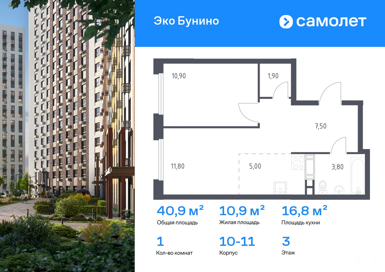 Строим кварталы для жизни с заботой о будущем. Предлагается 1-комнатная квартира комфорт-класса 40, 9 кв.м в корпусе 10-11 на 3 этаже, в ЖК «Эко Бунино»