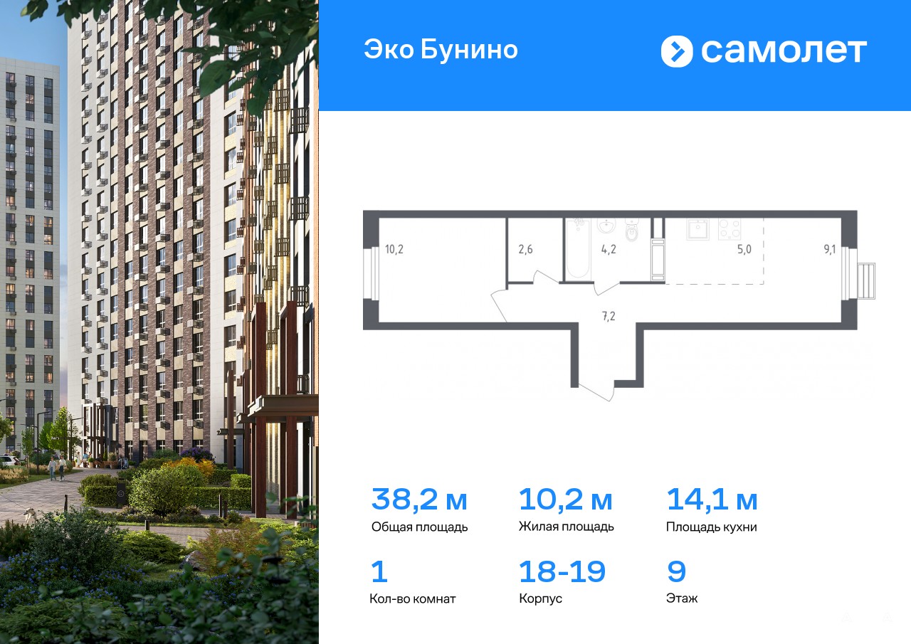 Предлагается 1-комнатная квартира комфорт-класса 38, 2 кв.м в корпусе 18-19 на 9 этаже, в ЖК «Эко Бунино»