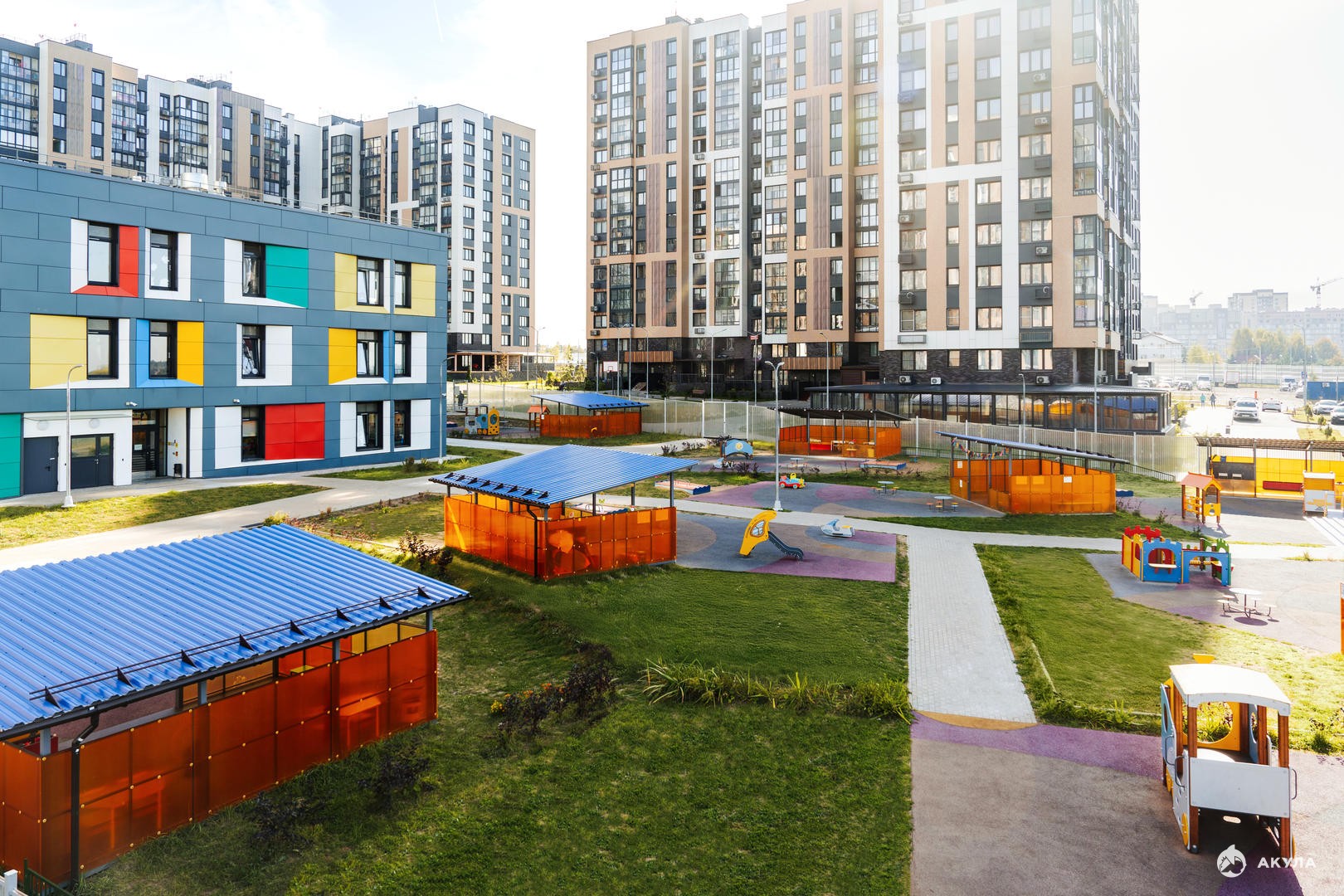 Во дворах-парках, закрытых от машин, комфортно и безопасно гулять. Здесь высажены уже взрослые деревья, которые создают прохладную тень в жаркий день.