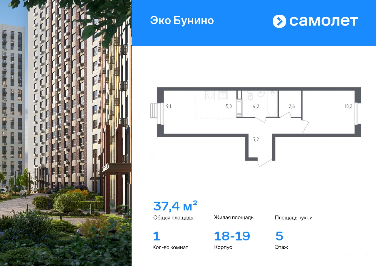 Строим кварталы для жизни с заботой о будущем. Предлагается 1-комнатная квартира комфорт-класса 37, 4 кв.м в корпусе 18-19 на 5 этаже, в ЖК «Эко Бунино»