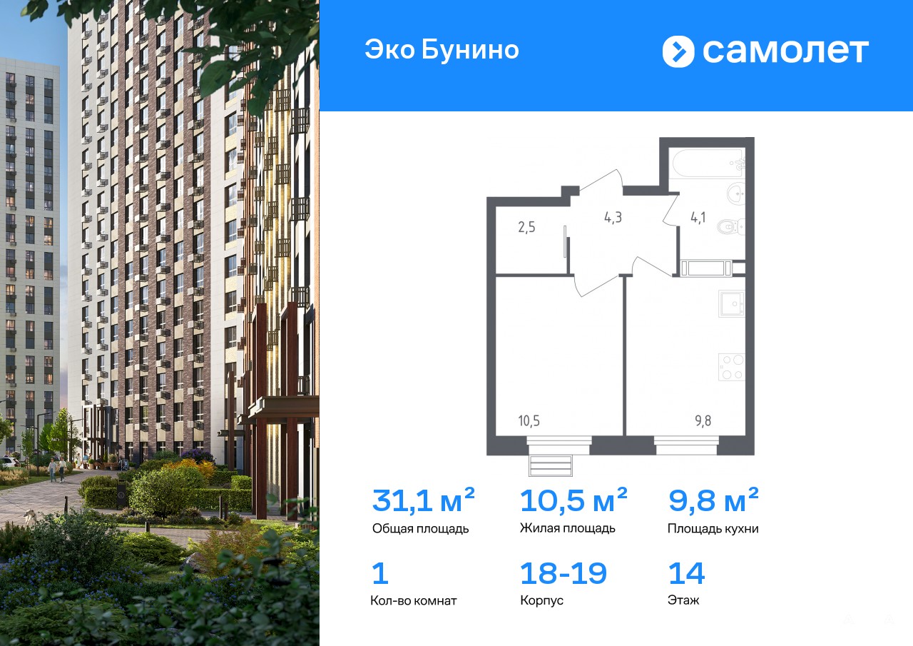 Строим кварталы для жизни с заботой о будущем. Предлагается 1-комнатная квартира комфорт-класса 31, 1 кв.м в корпусе 18-19 на 14 этаже, в ЖК «Эко Бунино»