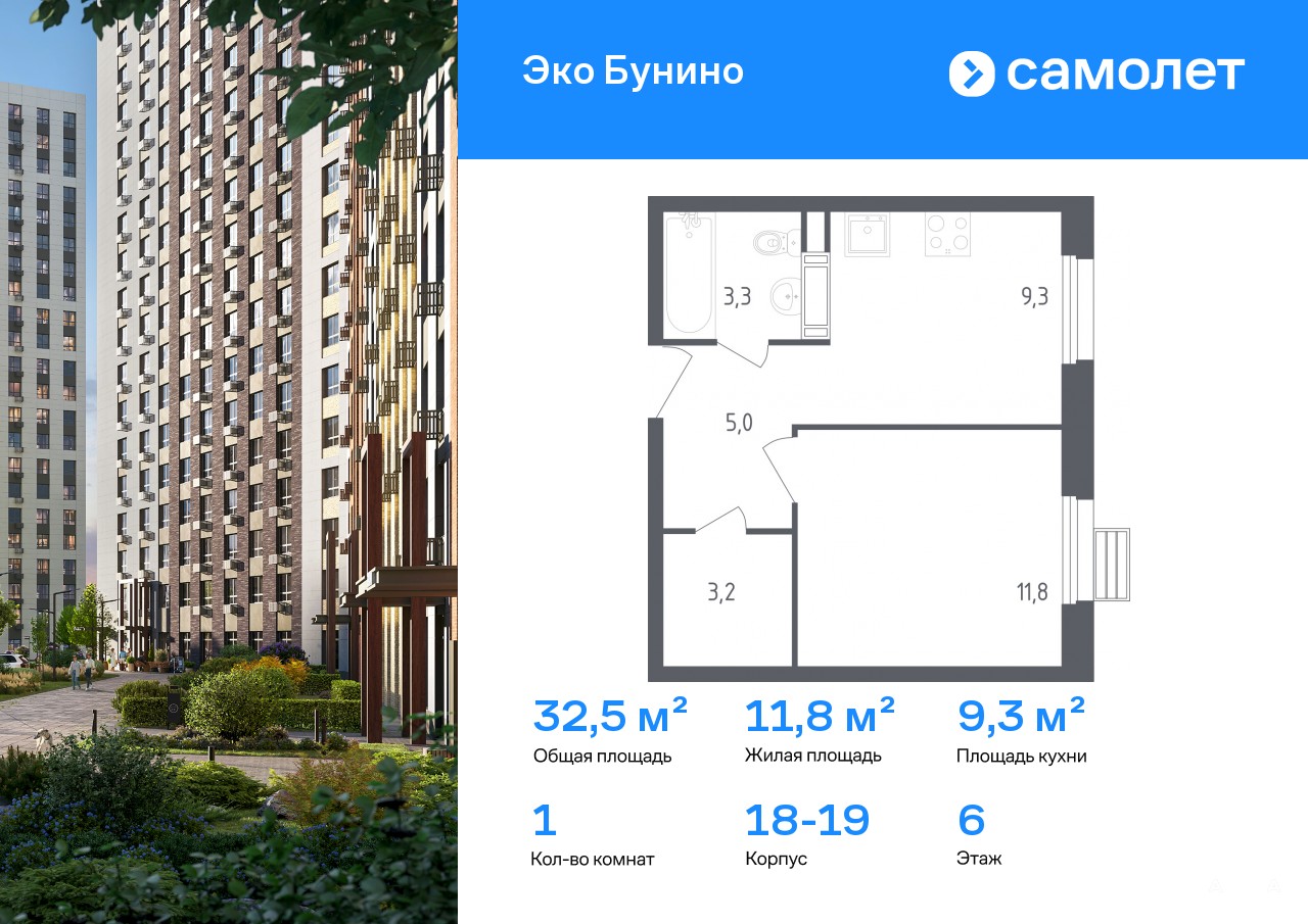 Строим кварталы для жизни с заботой о будущем. Предлагается 1-комнатная квартира комфорт-класса 32, 5 кв.м в корпусе 18-19 на 6 этаже, в ЖК «Эко Бунино»