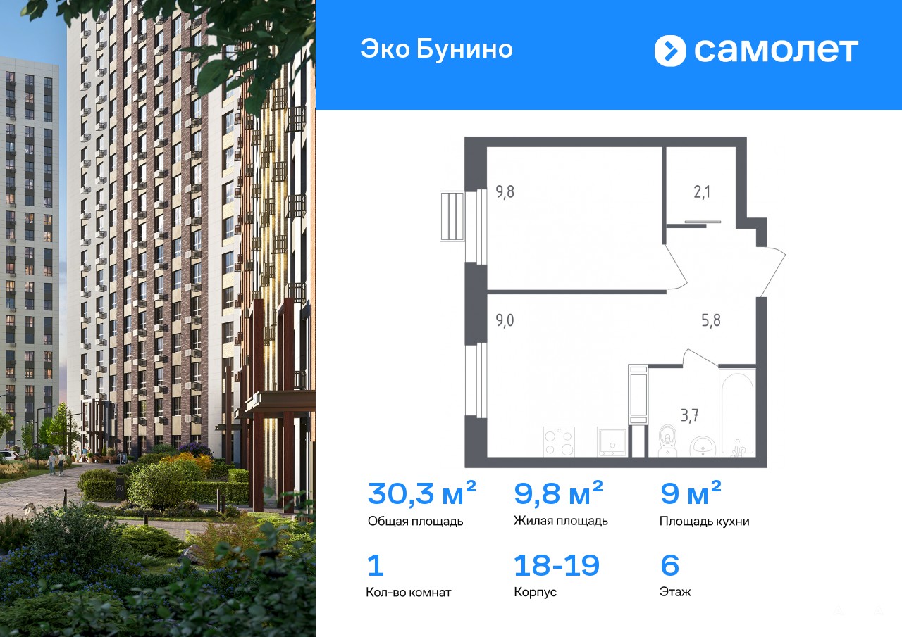 Строим кварталы для жизни с заботой о будущем. Предлагается 1-комнатная квартира комфорт-класса 30, 3 кв.м в корпусе 18-19 на 6 этаже, в ЖК «Эко Бунино»