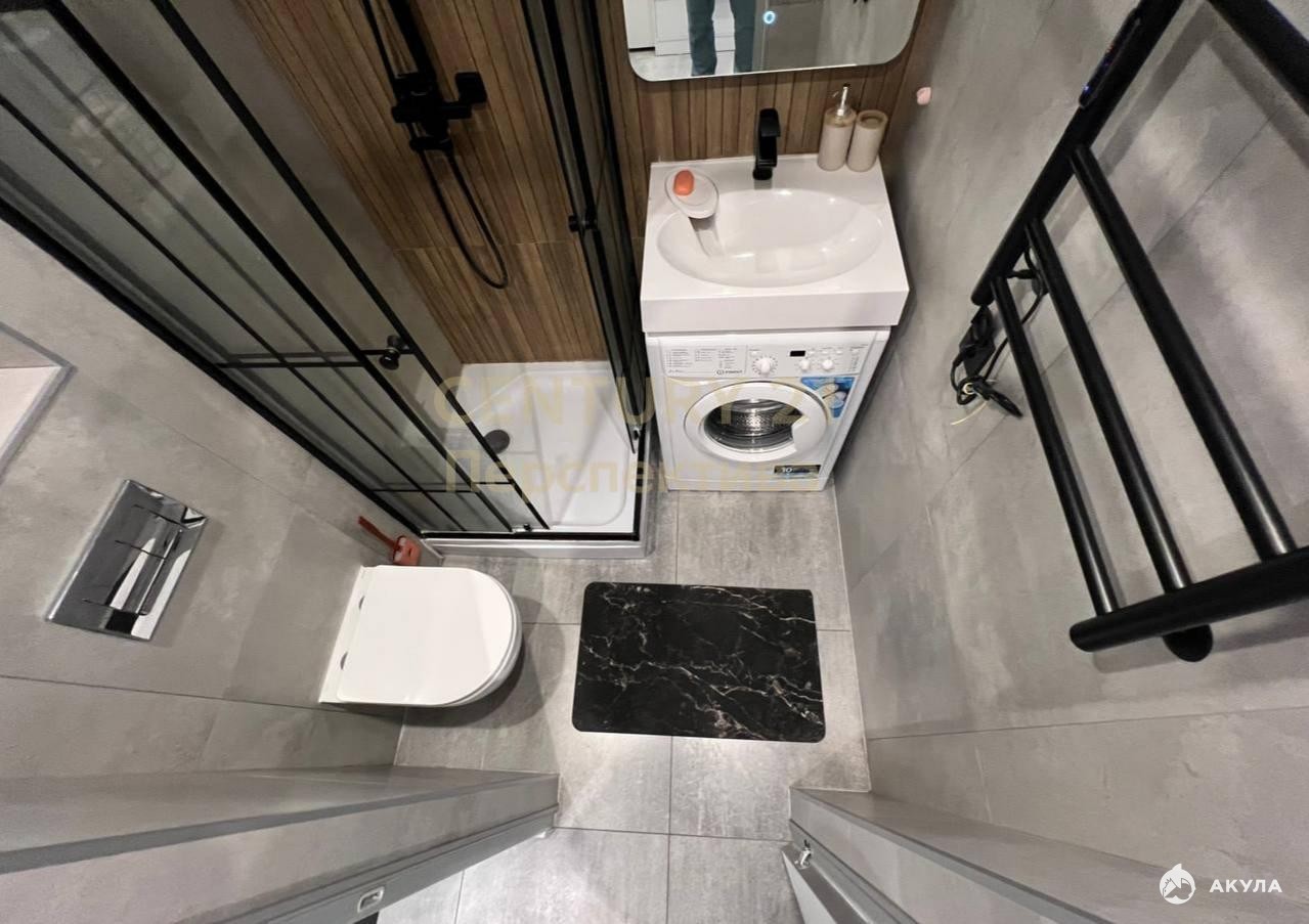 В совмещенном санузле установлена качественная сантехника — душевая кабина, унитаз, раковина, смесители.