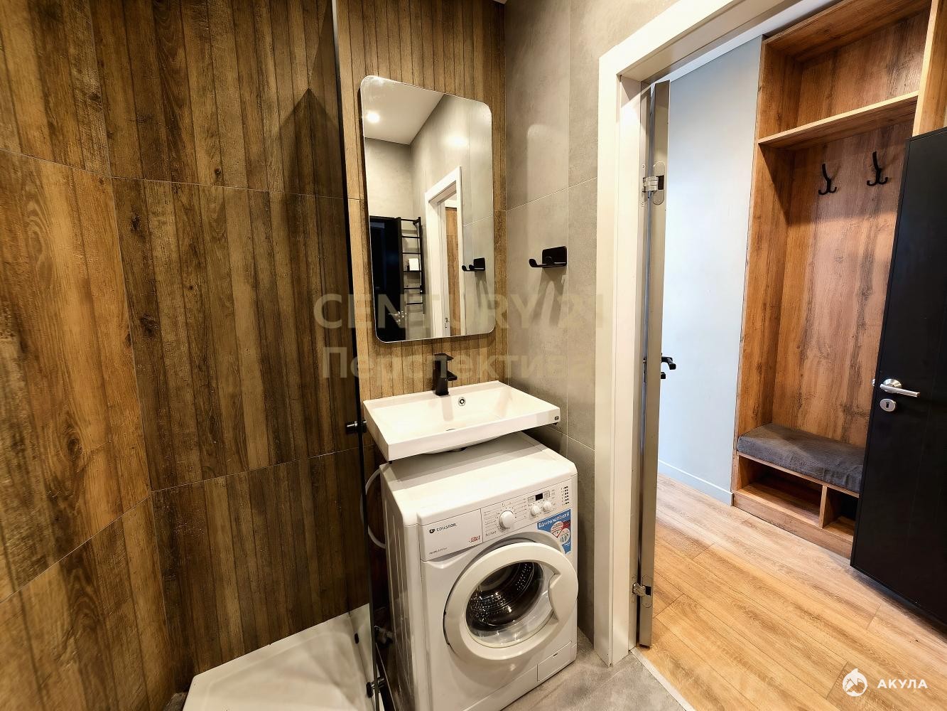 В совмещенном санузле установлена качественная сантехника — душевая кабина, унитаз, раковина, смесители.
