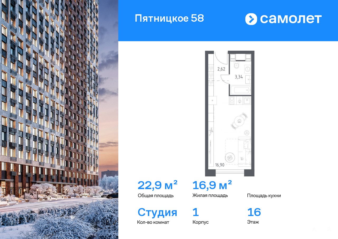 Строим кварталы для жизни с заботой о будущем. Предлагаются апартаменты студия комфорт-класса 22, 86 кв.м в корпусе 1 на 16 этаже, в ЖК «Пятницкое 58»