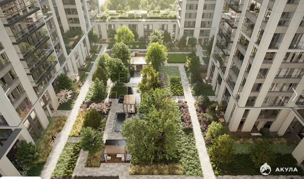 -между домами, а также на эксплуатируемой кровле третьего этажа разбиты живописные дворы-сады.