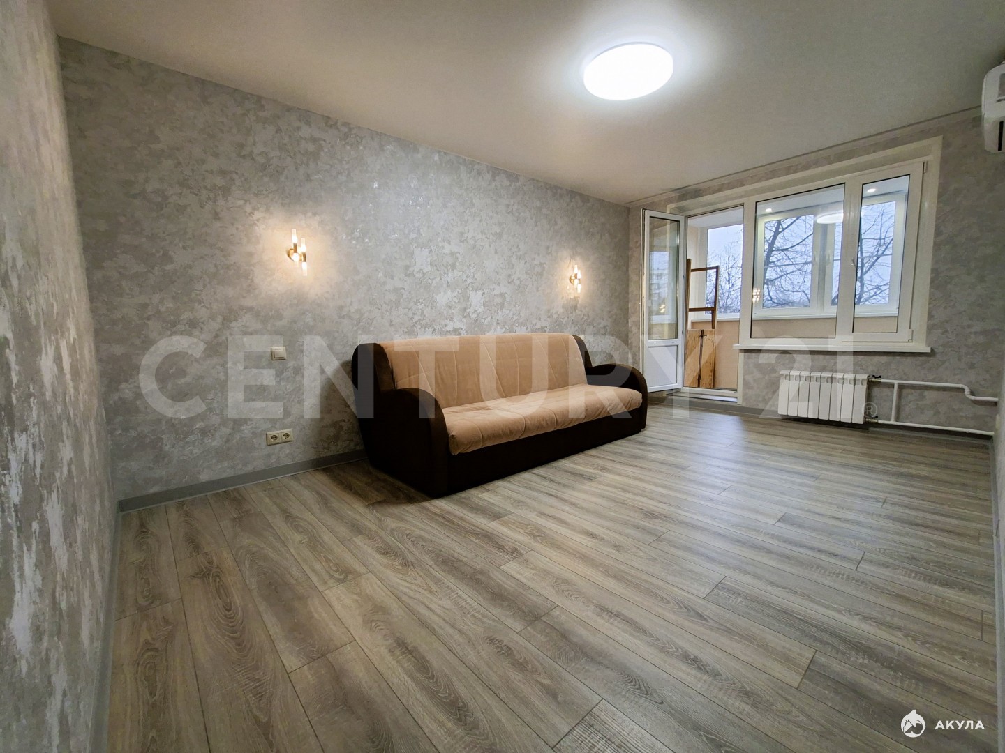 Одна комната с диваном, кондиционером и лоджией, вторая комната без мебели.