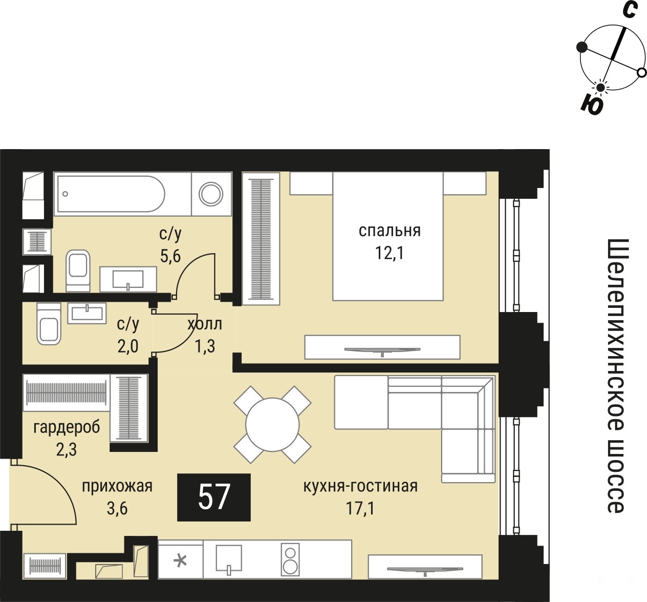 Просторная 1-комн. квартира в ЖК "Шелепиха" на 13 этаже. Квартира без отделки, новый владелец может сделать ремонт по индивидуальному дизайн-проекту. Общая площадь: 44.5 кв.м., жилая: 12.1 кв.м., площадь просторной кухни-столовой: 17.1 кв.м. Все окна выходят на одну сторону. В квартире один совмещенный и один раздельный санузел. Высота потолков 3 м.