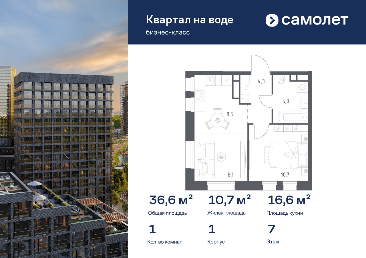 Предлагается 1-комнатная квартира бизнес-класса 36, 6 кв.м в корпусе 1 на 7 этаже, в ЖК «Квартал на воде»