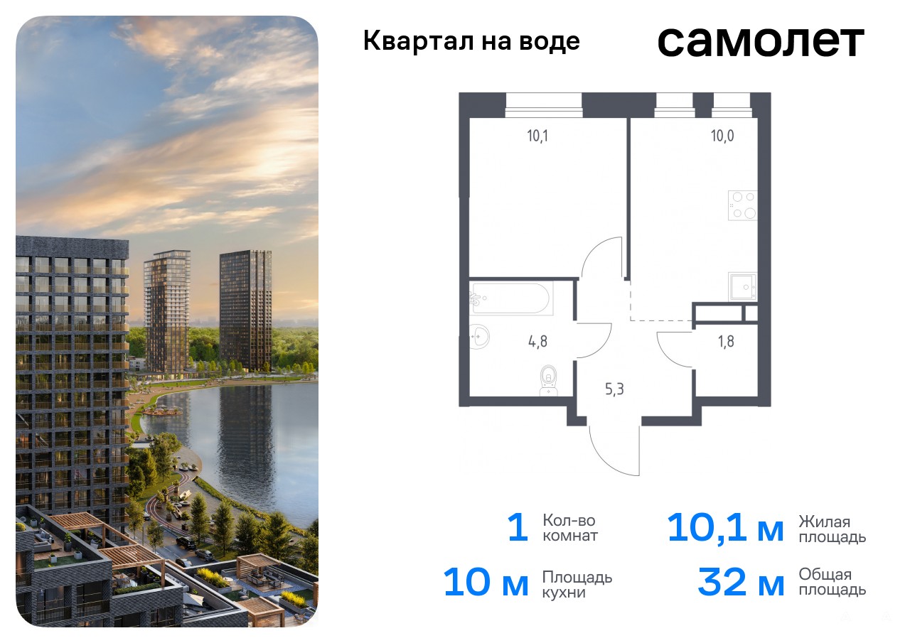 Предлагается 1-комнатная квартира бизнес-класса 32 кв.м в корпусе 1 на 2 этаже, в ЖК «Квартал на воде»