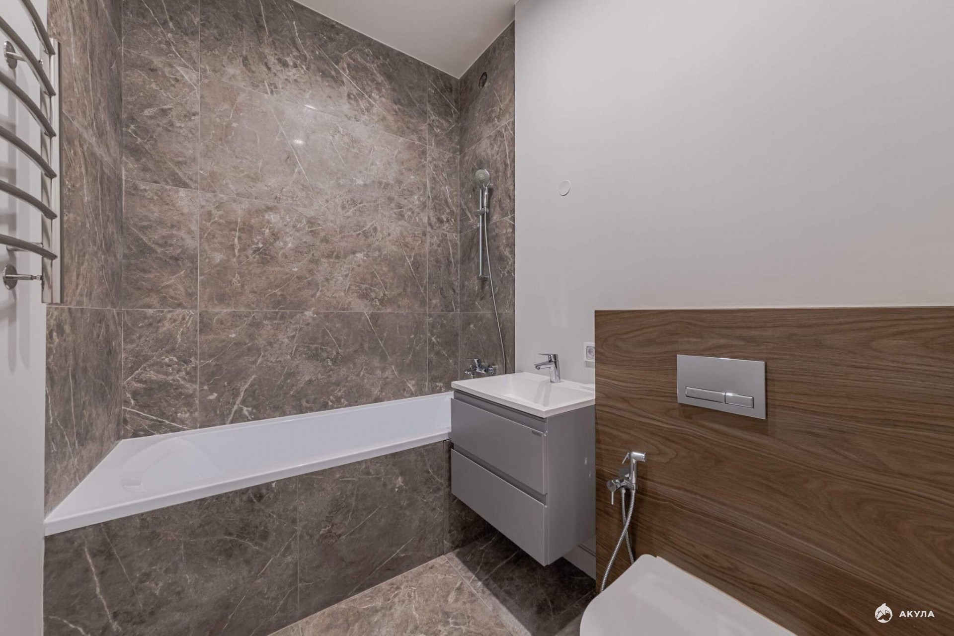 В санузле установлена вся сантехника, тумбочка под раковину, оборудован теплый пол.