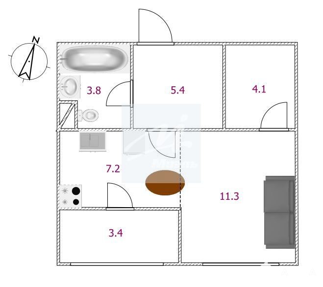 Студия имеет удобную планировку: жилая площадь — 11, 3 кв. м, кухня — 7, 2 кв. м. Есть лоджия, где можно обустроить место для отдыха, вместительная гардеробная.