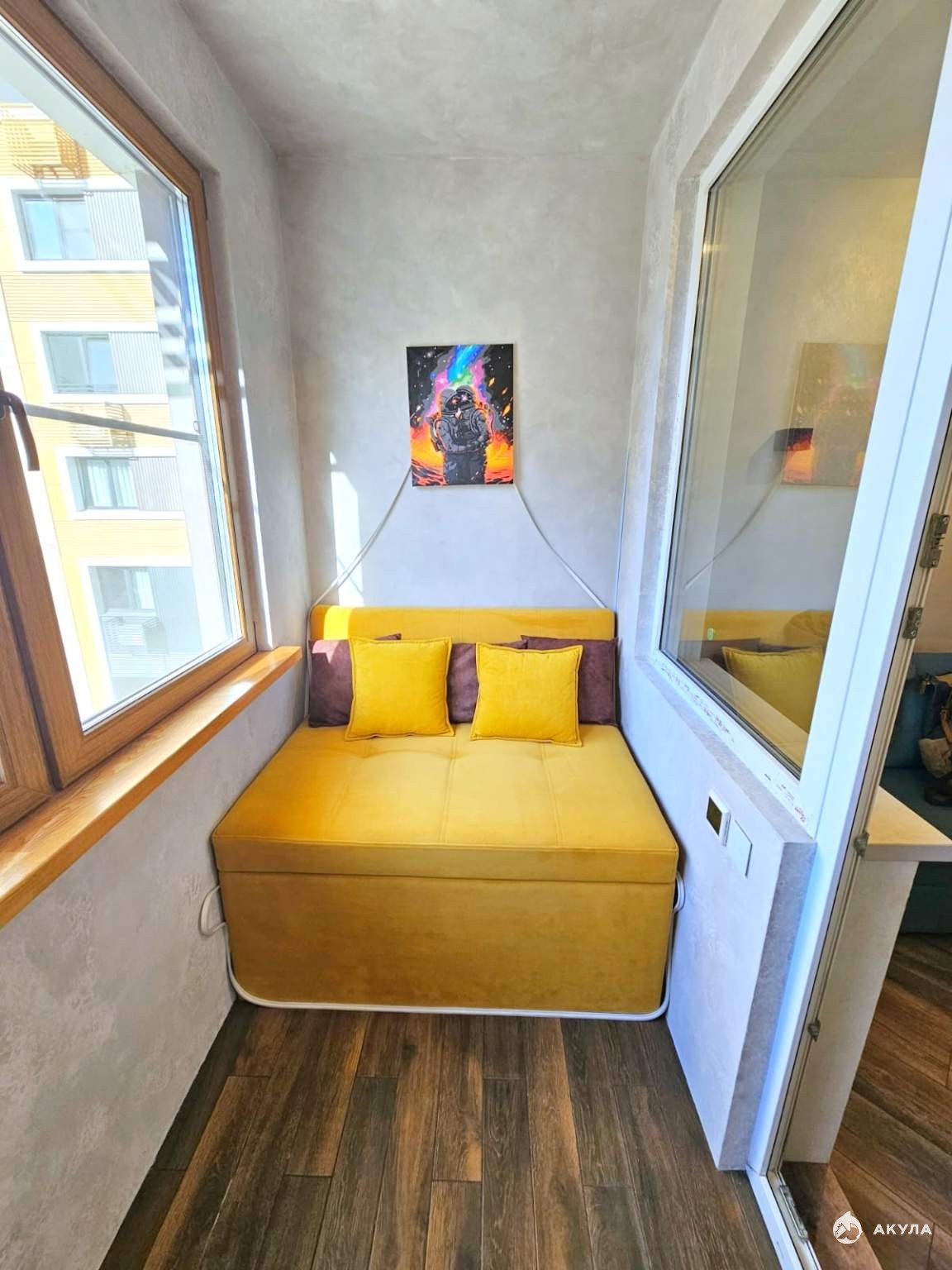 - Просторная лоджия 3, 6м2: оборудовано место для работы и отдыха, тепло, просторно и уютно.