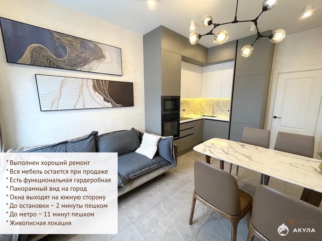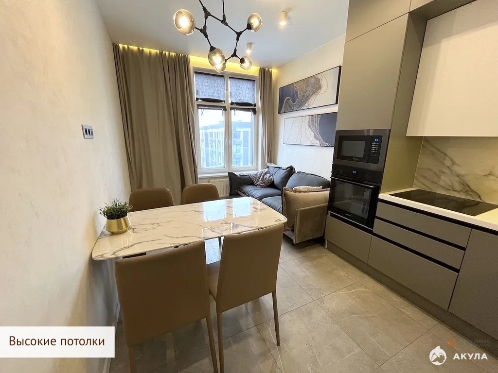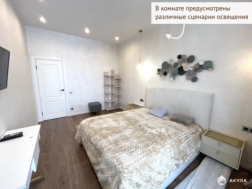 Во всей квартире установлены натяжные потолки. В коридоре имеется система «теплый пол». В санузле как дополнительный элемент расположена панель из стабилизированного мха. В комнате предусмотрены различные сценарии освещения. Кухня оснащена всей необходимой встроенный бытовой техникой и мебелью. Имеется кондиционер.