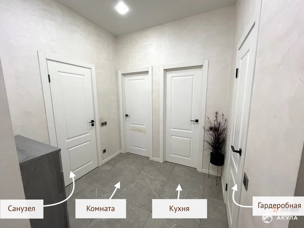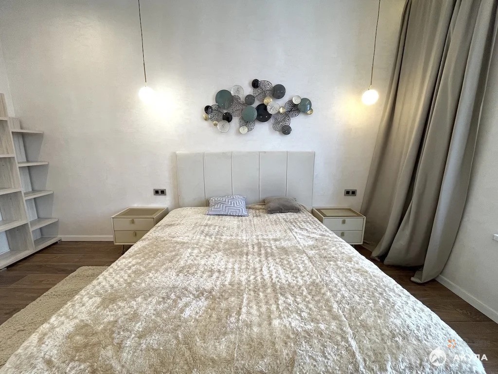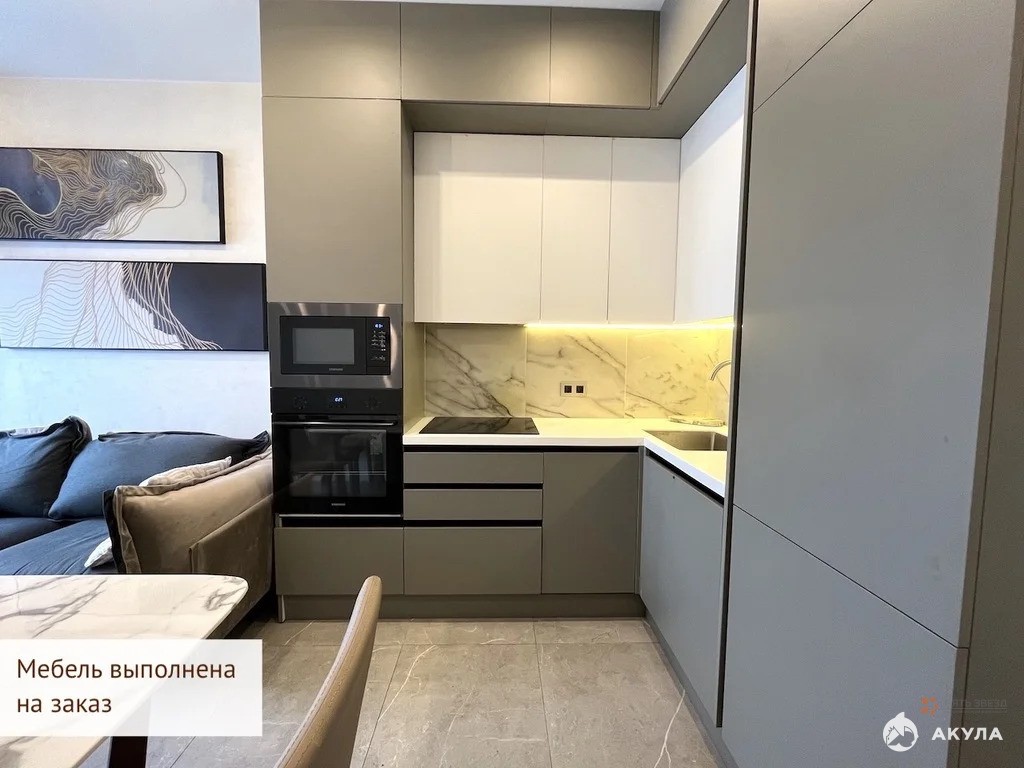 Квартира с хорошим ремонтом и мебелью на заказ единое пространство которой очень грамотно и функционально организовано: коридор плавно переходит на кухню, в комнату и в гардеробную. Светлые оттенки добавляют помещению необычайную легкость и уют, сохраняя в себе черты современного дизайна интерьера.