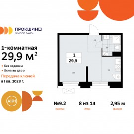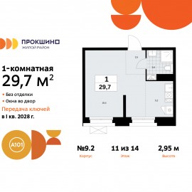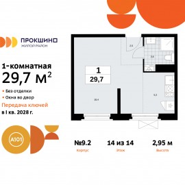 Однокомнатная квартира-студия от застройщика в ЖК "Прокшино" на 14 этаже. Квартира без отделки, полностью готова к чистовой отделке и дальнейшему ремонту. Общая площадь: 29.7 кв.м., площадь гостиной 23.6 кв.м., из которых 5.2 кв.м. выделено под кухонную зону. Все окна выходят на одну...