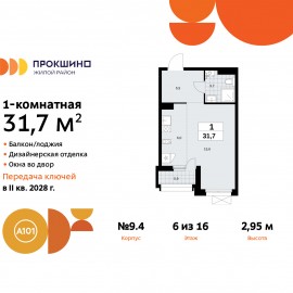 Просторная 1-комн. квартира-студия с отделкой в ЖК "Прокшино" на 6 этаже. Общая площадь: 31.7 кв.м., площадь гостиной 22.2 кв.м., из которых 6.9 кв.м. выделено под кухонную зону. Все окна выходят на одну сторону. В квартире одна лоджия, один совмещенный санузел. Высота потолков 2.95 м. Эта...