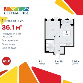 Продается 1-комн. квартира от застройщика с отделкой в ЖК "Деснаречье" на 9 этаже. Общая площадь: 36.1 кв.м., жилая: 11.9 кв.м., площадь просторной кухни-столовой: 13.1 кв.м. Все окна выходят на одну сторону. В квартире одна лоджия, один совмещенный санузел. Высота потолков 2.95 м. Эта...