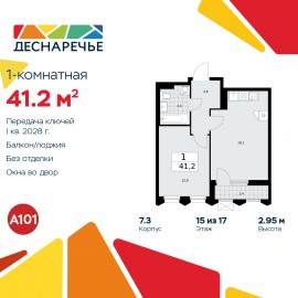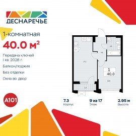 Продается однокомнатная квартира от застройщика с отделкой в ЖК "Деснаречье" на 17 этаже. Общая площадь: 40.7 кв.м., жилая: 11.4 кв.м., площадь просторной кухни-столовой: 16.5 кв.м. Все окна выходят на одну сторону. В квартире одна лоджия, один совмещенный санузел. Высота потолков 2.95...
