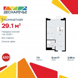 Продается 1-комн. квартира-студия в ЖК "Деснаречье" на 12 этаже. Квартира без отделки, после оформления собственности можно делать ремонт. Общая площадь: 29.1 кв.м., площадь гостиной 20.4 кв.м., из которых 5.7 кв.м. выделено под кухонную зону. Все окна выходят на одну сторону. В...