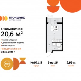 Просторная 1-комн. квартира-студия с предчистовой отделкой в ЖК "Прокшино" на 9 этаже. Общая площадь: 20.6 кв.м., площадь гостиной 13.6 кв.м., из которых 5.1 кв.м. выделено под кухонную зону. Все окна выходят на одну сторону. В квартире один балкон, один совмещенный санузел. Высота...