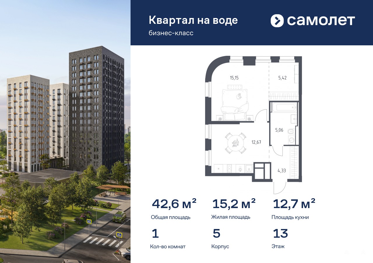 Строим кварталы для жизни с заботой о будущем. Предлагается 1-комнатная квартира бизнес-класса 42, 63 кв.м в корпусе 5 на 13 этаже, в ЖК «Квартал на воде»