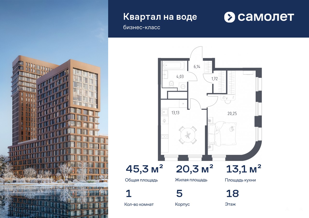Строим кварталы для жизни с заботой о будущем. Предлагается 1-комнатная квартира бизнес-класса 45, 27 кв.м в корпусе 5 на 18 этаже, в ЖК «Квартал на воде»