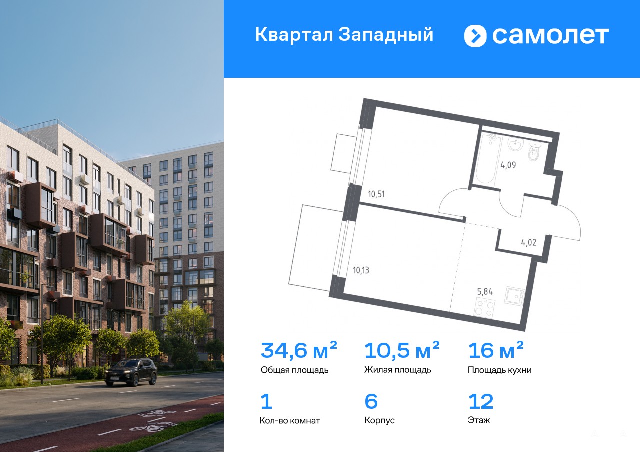 Строим кварталы для жизни с заботой о будущем. Предлагается 1-комнатная квартира комфорт-класса 34, 59 кв.м в корпусе 6 на 12 этаже, в ЖК «Квартал Западный»