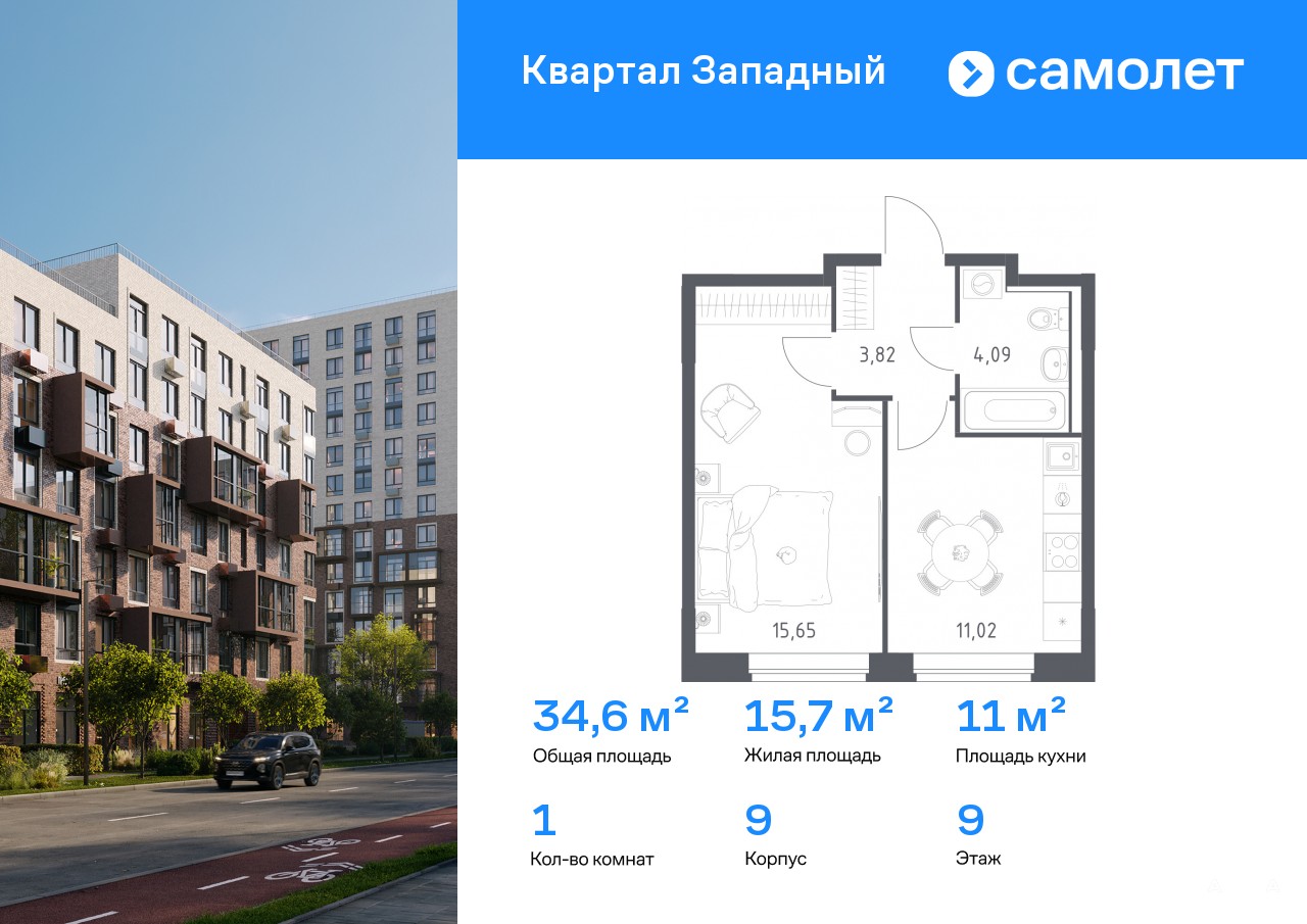 Строим кварталы для жизни с заботой о будущем. Предлагается 1-комнатная квартира комфорт-класса 34, 58 кв.м в корпусе 9 на 9 этаже, в ЖК «Квартал Западный»