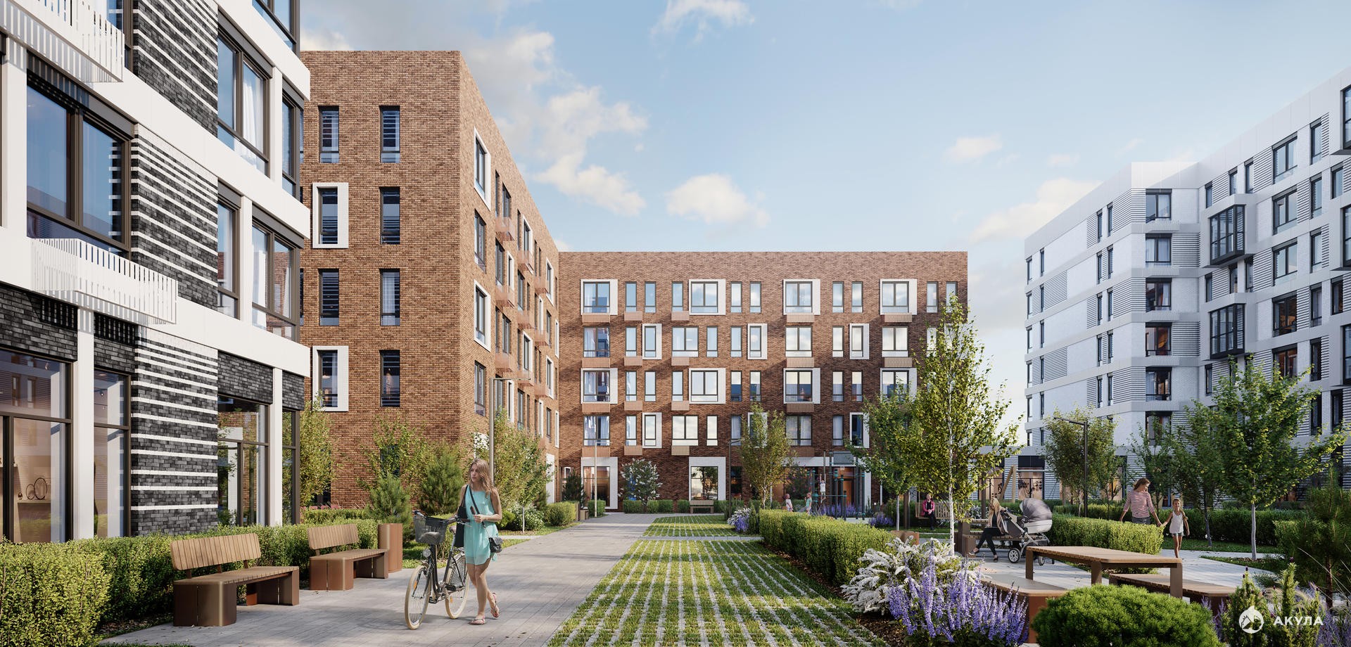 Дворы — тихое зеленое пространство без машин. В проекте появится собственный ландшафтный парк с благоустроенной набережной и центральная площадь, на которой будут проводиться различные мероприятия.