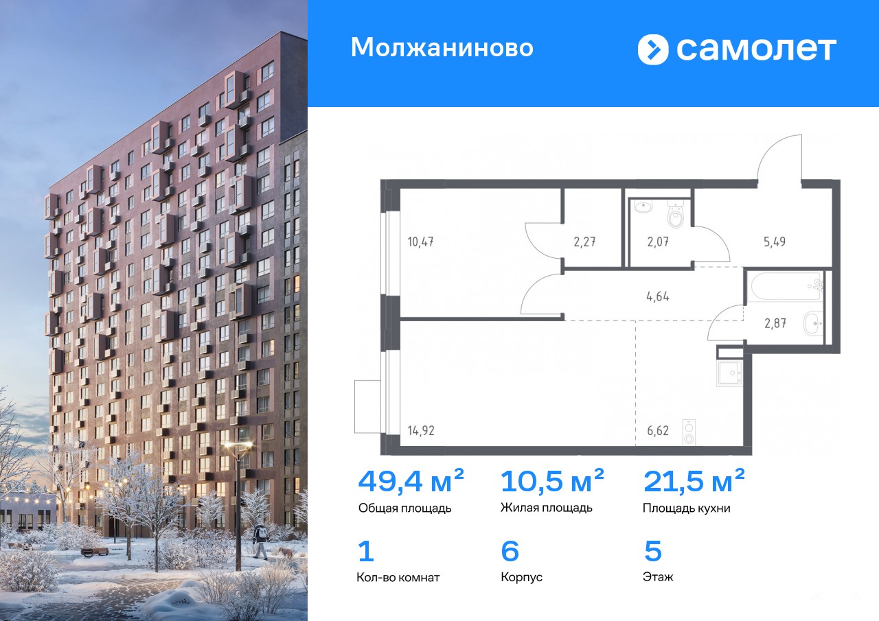 Строим кварталы для жизни с заботой о будущем. Предлагается 1-комнатная квартира комфорт-класса 49, 35 кв.м в корпусе 6 на 5 этаже, в ЖК «Молжаниново»