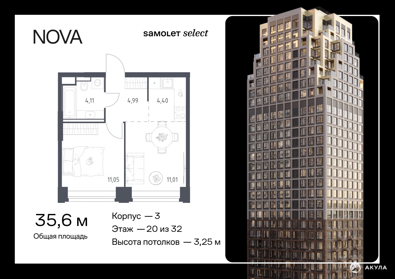 Строим кварталы для жизни с заботой о будущем. Предлагается 1-комнатная квартира премиум-класса 35, 56 кв.м в корпусе 3 на 20 этаже, в ЖК «NOVA»