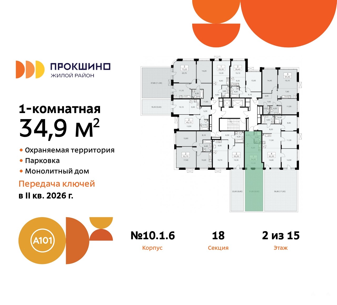 Просторная 1-комн. квартира с отделкой в ЖК "Прокшино" на 2 этаже. Общая площадь: 34.9 кв.м., жилая: 11.1 кв.м., площадь кухни: 6.2 кв.м. Все окна выходят на одну сторону. В квартире один балкон, один совмещенный санузел. Наличие в квартире террасы открывает возможность для создания зон отдыха в кругу семьи и друзей. Высота потолков 2.99 м.