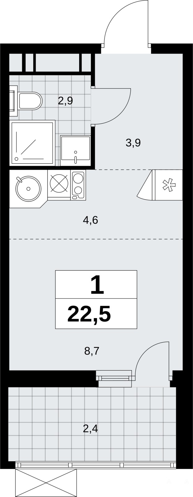 1-комн. квартира-студия в ЖК "Скандинавия" на 14 этаже. Квартира без отделки, после оформления собственности можно делать ремонт. Общая площадь: 22.5 кв.м., площадь гостиной 13.3 кв.м., из которых 4.6 кв.м. выделено под кухонную зону. Все окна выходят на одну сторону. В квартире один балкон, один совмещенный санузел. Высота потолков 2.95 м.