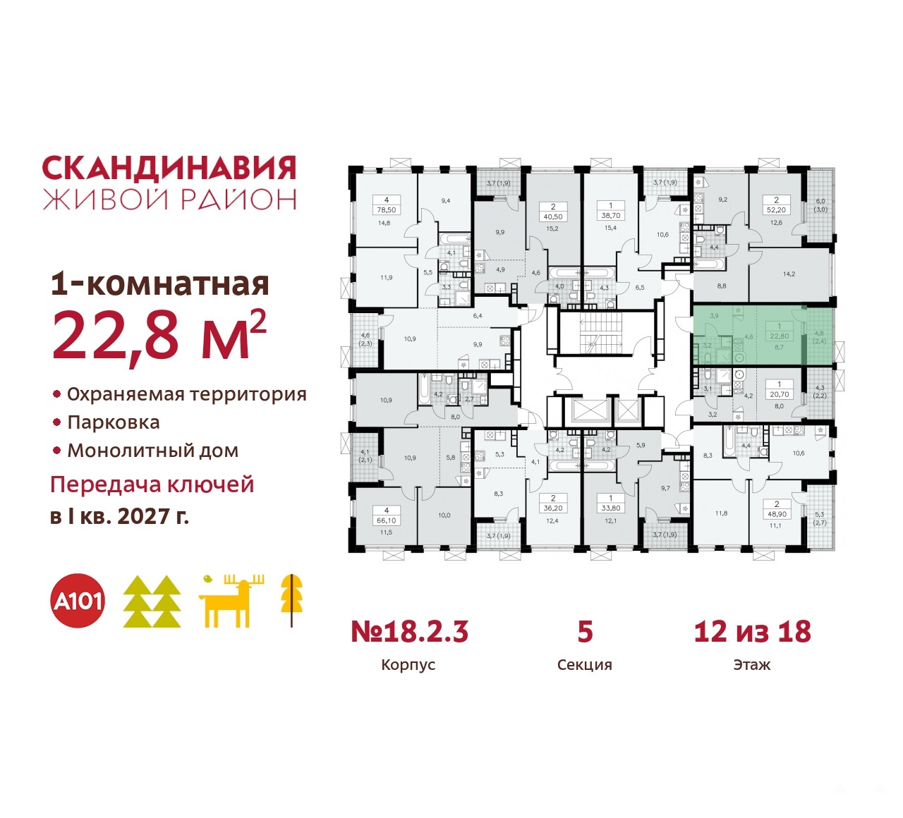 Квартира находится в корпусе 2.18.2.3. Дом монолитный, одноподъездный, высотой 18 этажей. На этаже 8 квартир. В подъезде 1 пассажирский и 1 грузовой лифт. Начало строительства - 1 квартал 2024 года. Окончание строительства - 1 квартал 2027 года. Оформление сделки по договору долевого участия.