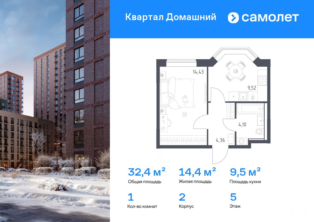Строим кварталы для жизни с заботой о будущем. Предлагается 1-комнатная квартира комфорт-класса 32, 41 кв.м в корпусе 2 на 5 этаже, в ЖК «Квартал Домашний»