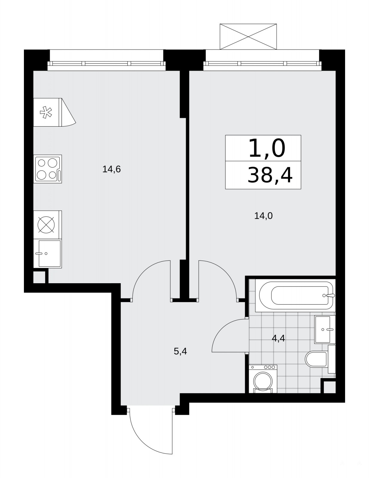 Просторная 1-комн. квартира с предчистовой отделкой в ЖК "Прокшино" на 2 этаже. Общая площадь: 38.4 кв.м., жилая: 14 кв.м., площадь просторной кухни-столовой: 14.6 кв.м. Все окна выходят на одну сторону. В квартире один совмещенный санузел. Высота потолков 2.99 м.