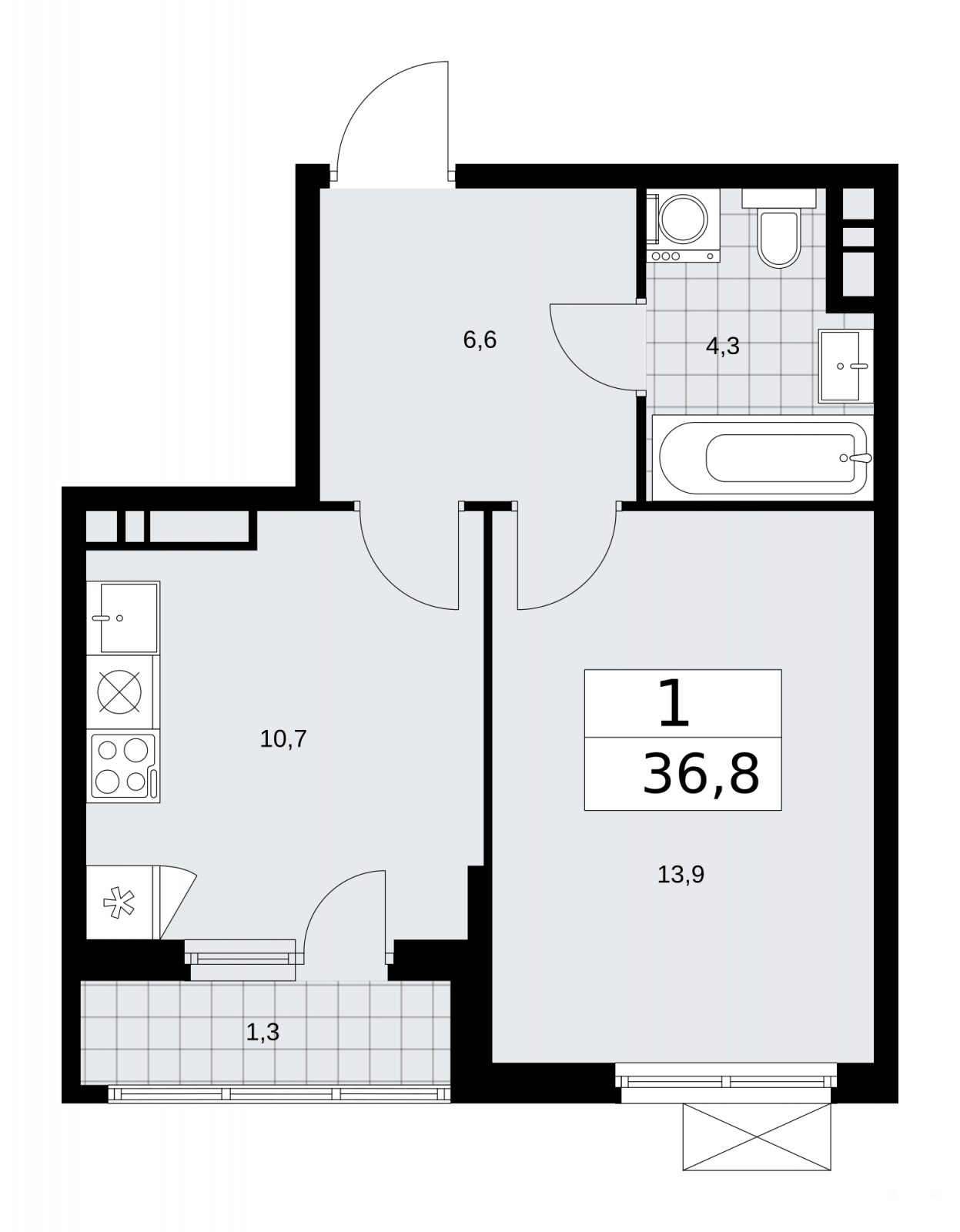 Однокомнатная квартира от застройщика с отделкой "WHITE BOX" в ЖК "Прокшино" на 13 этаже. Общая площадь: 36.8 кв.м., жилая: 13.9 кв.м., площадь просторной кухни-столовой: 10.7 кв.м. Все окна выходят на одну сторону. В квартире одна лоджия, один совмещенный санузел. Высота потолков 2.8 м.