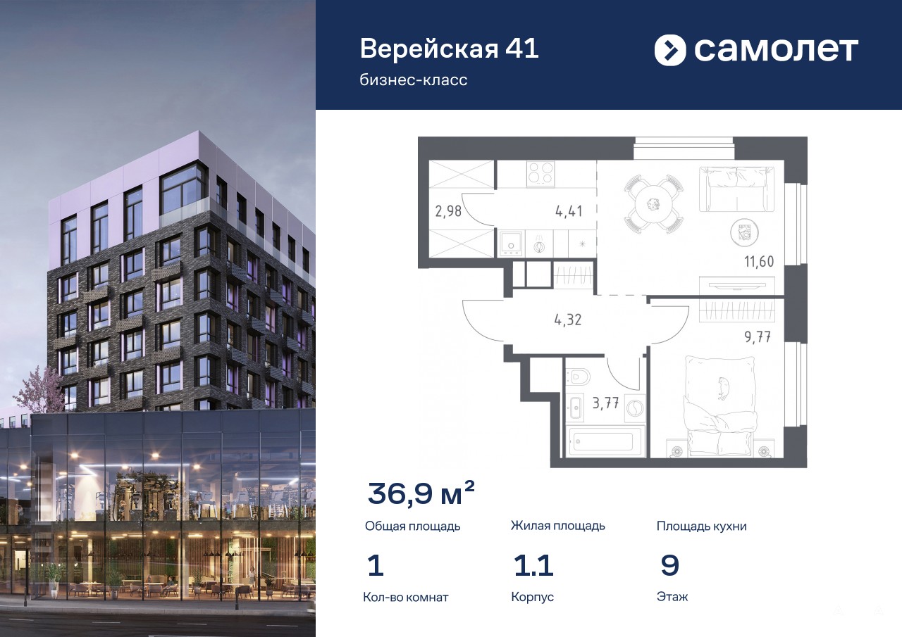 Строим кварталы для жизни с заботой о будущем. Предлагается 1-комнатная квартира бизнес-класса 36, 85 кв.м в корпусе 1.1 на 9 этаже, в «Верейская 41»