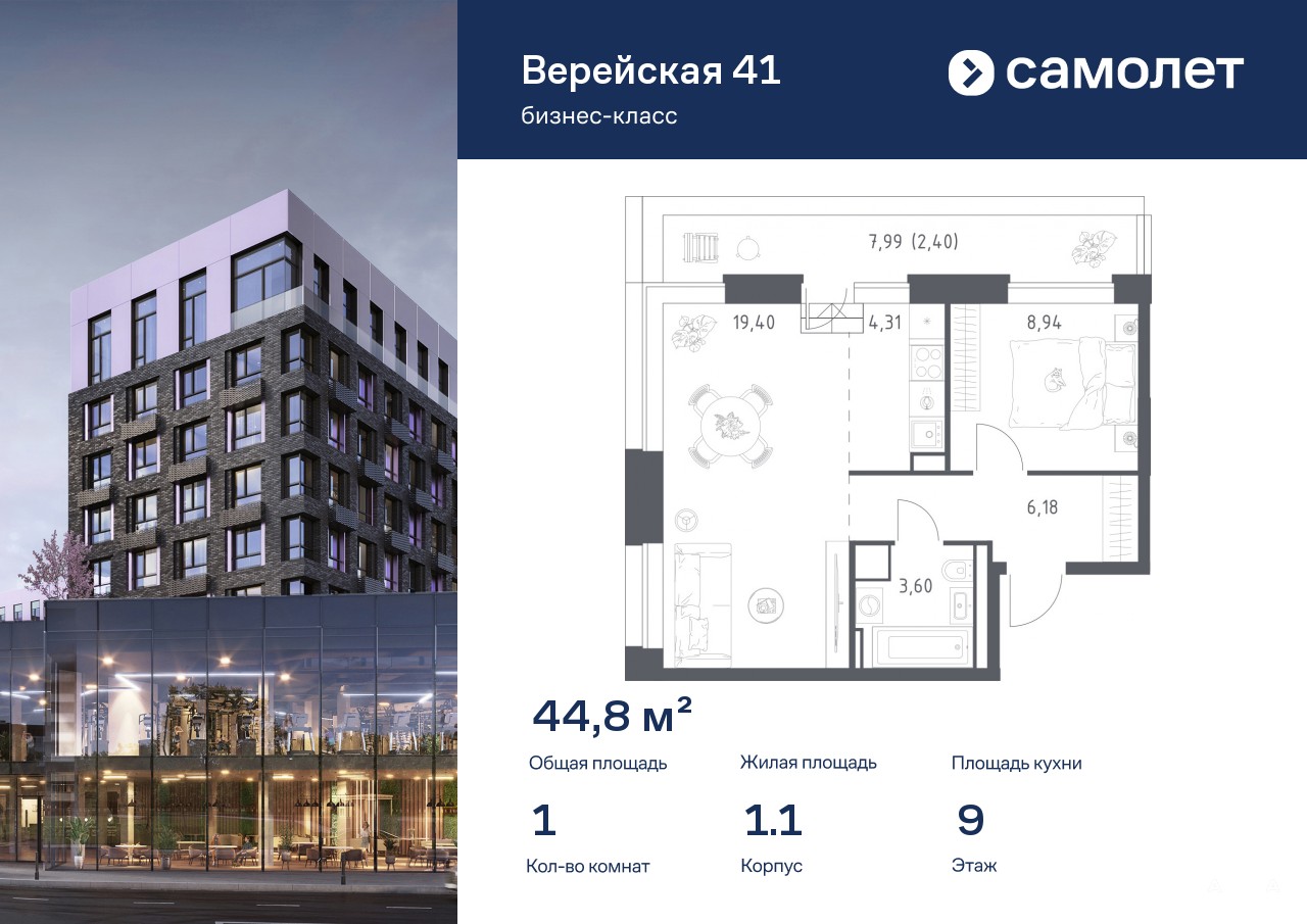 Строим кварталы для жизни с заботой о будущем. Предлагается 1-комнатная квартира бизнес-класса 44, 83 кв.м в корпусе 1.1 на 9 этаже, в «Верейская 41»