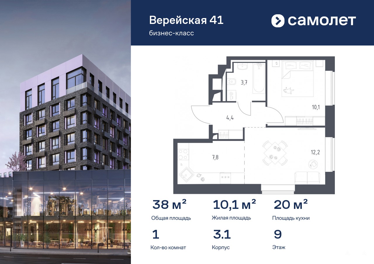Строим кварталы для жизни с заботой о будущем. Предлагается 1-комнатная квартира бизнес-класса 37, 99 кв.м в корпусе 3.1 на 9 этаже, в «Верейская 41»