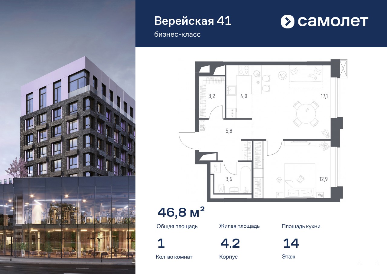 Строим кварталы для жизни с заботой о будущем. Предлагается 1-комнатная квартира бизнес-класса 46, 8 кв.м в корпусе 4.2 на 14 этаже, в «Верейская 41»